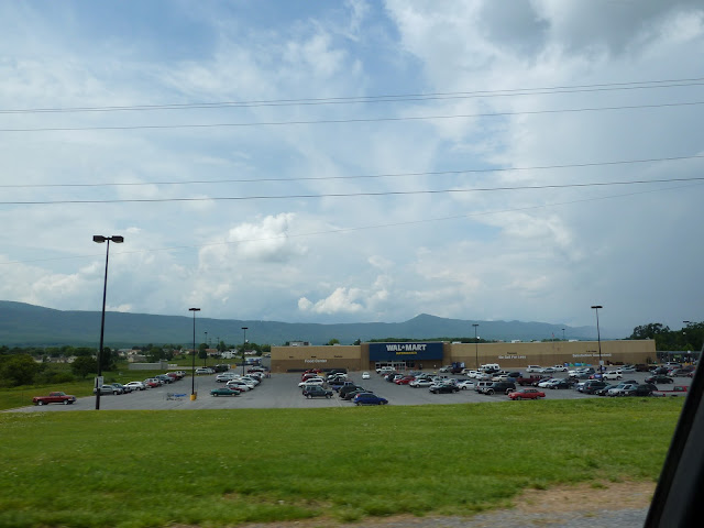 Small towns tight up to the Blue Ridge Mountains, with drug stores and blue rooster candle maker shops.