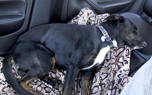 Blue-dog seeming tuckered from her mandatory visit to the vet for tutoring